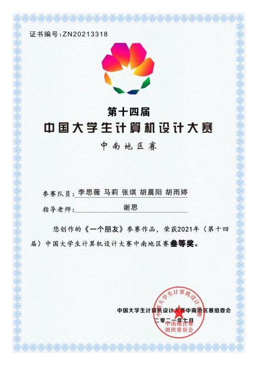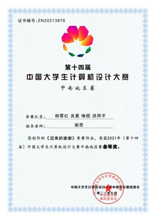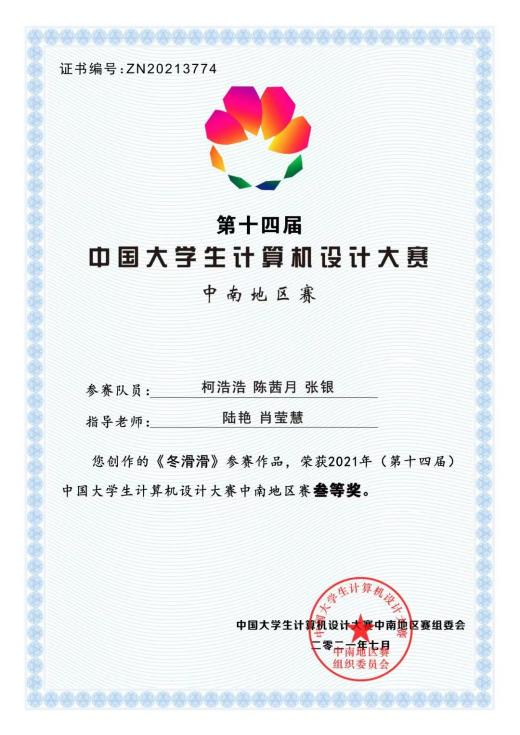 在2021年(第14届)中国计算机设计大赛中,我院共申报5项参赛作品,各团队以冬奥会为主题创作了微电影《迟来的谢谢》《倔强》《画展》《一个朋友》和游戏作品《冬滑滑》,均荣膺中国计算机设计大赛中南赛区叁等奖的优异成绩。